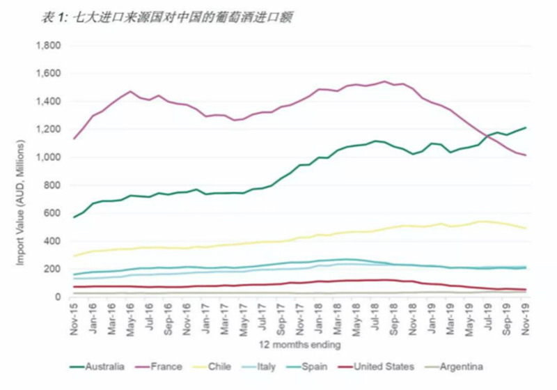 截至2019年12月底的12个月中,澳大利亚葡萄酒对中国市场(包括香港和澳门)的出口额增长12%,创下12.8亿澳元新高,出口量下滑17%至1.42亿升 (等量于1580万箱9升装)。平均出口额增长35%至8.99澳元(每升离岸价)。澳大利亚葡萄酒对中国市场的出口总额及平均出口额双双创下了年度新高。