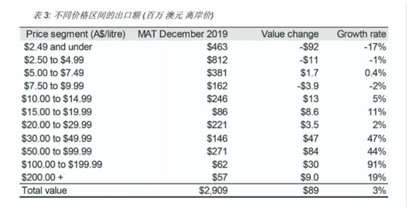 价格低于2.5 澳元/升(离岸价)的澳洲葡萄酒出口额下降最为明显,降低了17%至4.63 亿澳元。
