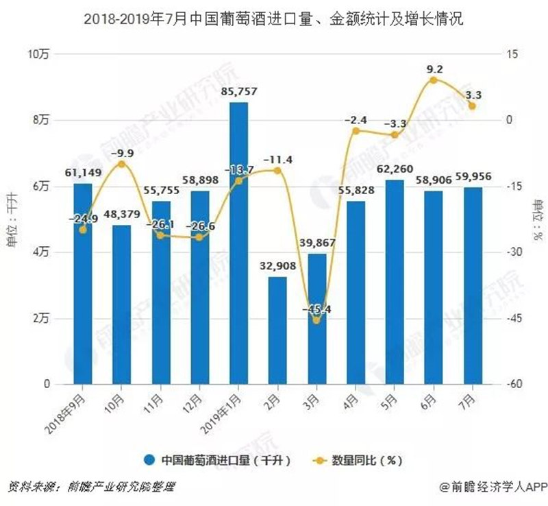 据中国海关总署数据显示,2019年1-2季度中国葡萄酒进口量有所增长,2019年7月中国葡萄酒进口量为59956千升,同比增长3.3%。累计方面,2019年1-7月中国葡萄酒进口量达到395429千升,同比下降10.8%。