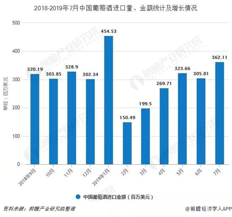 根据以上数据可得一下信息:2019年前7月中国葡萄酒进口金额突破20亿美元!从进口量看,中国进口葡萄酒市场的需求量仍很大!而随着国家对国际贸易、葡萄酒关税等多方面的政策优惠,进口葡萄酒行业的门槛也将降低。以上现象都在表明中国进口葡萄酒市场将迎来一个长期增长的黄金时期!葡萄酒核心消费人群年轻化趋势逐渐明显,年轻一代更愿意尝试并寻找不同国家的进口葡萄酒,也为进口葡萄酒加盟行业带来了坚实的市场基础。未来,葡萄酒健康饮食文化或成为21世纪又一个爆款行业,加盟代理进口葡萄酒大有可为!