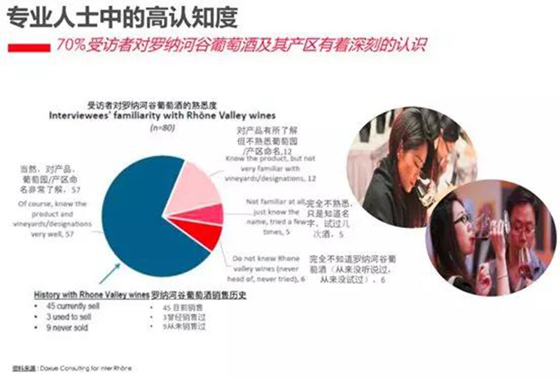 一个产区在一个市场发展的好,除了来自该产区的葡萄酒本身的品质、性价比这些自身条件外,市场对来自该产区的产品的认知同样非常重要。特别是行业内的专业人士,自身对产区了解足够深入,在向消费者推荐的时候才更游刃有余,才能将产区的优势更好的传达给消费者,从而带动整个产区在中国市场的发展。这一点在罗纳河谷葡萄酒也有一个非常好的体现,据罗纳河谷葡萄酒产区协会的一项调研数据显示,超过70%的专业受访者对罗纳河谷有着深刻的认识,这无疑就对罗纳河谷葡萄酒在中国的发展带来了极大的推动作用。而从消费者端的调研数据来看,罗纳河谷葡萄酒已经拥有了超过30%的认知度。