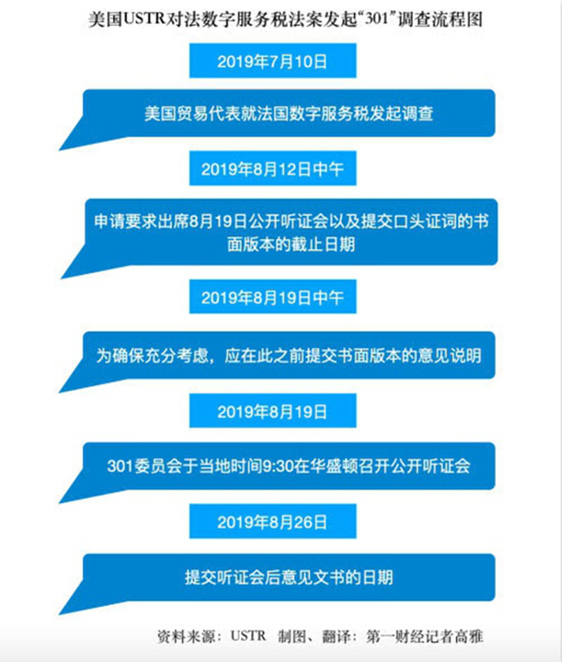 USTR在对法“301调查”后,认定法国数字服务税歧视美国企业,拟向63项总价值为24亿美元的法国输美产品加征最高100%的关税,USTR此前还特地在声明中指出,在听证会后,希望“迅速进行征税等活动”。